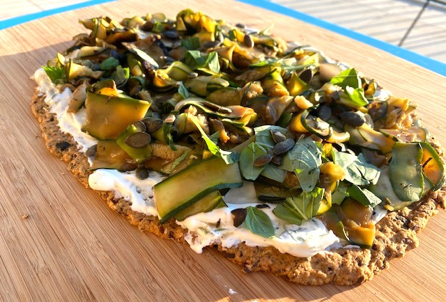 J'ai ici opté pour une garniture de saison des plus express : des courgettes coupées en très fines rondelles juste snackées à la poêle, du fromage frais savamment assaisonné et puis quelques graines et herbes fraîches pour sublimer le tout...