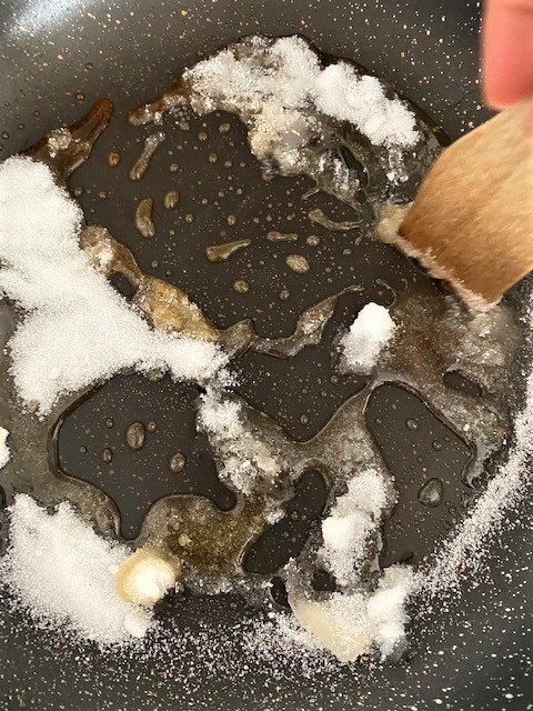 Quand le caramel commence à prendre une belle couleur dorée (même s'il reste encore quelques endroits où le sucre n’est pas totalement fondu), sortir du feu et mélanger vivement le tout pour obtenir un caramel ambré en faisant maintenant des gestes amples dans toute la poêle pour bien homogénéiser le tout.